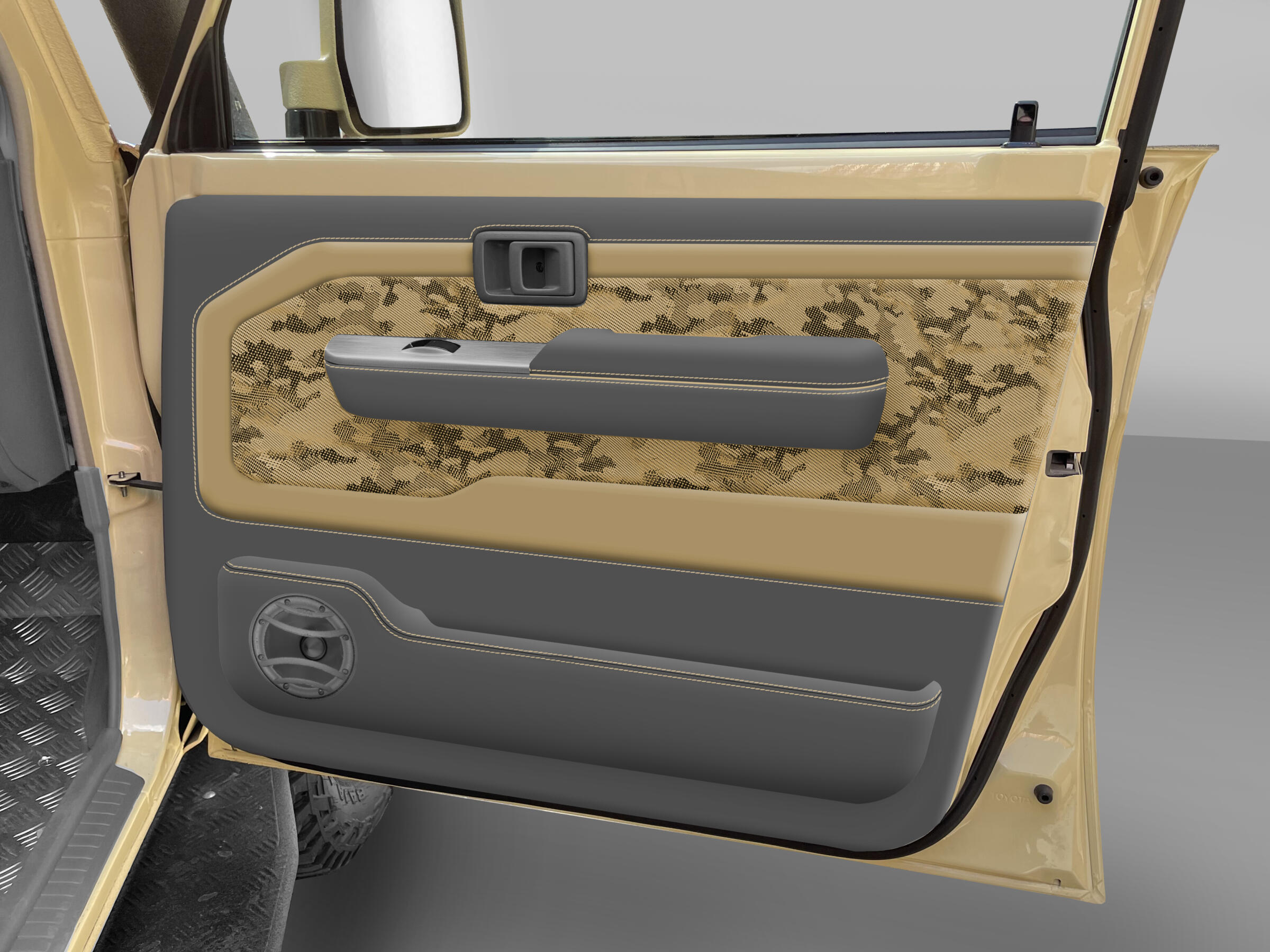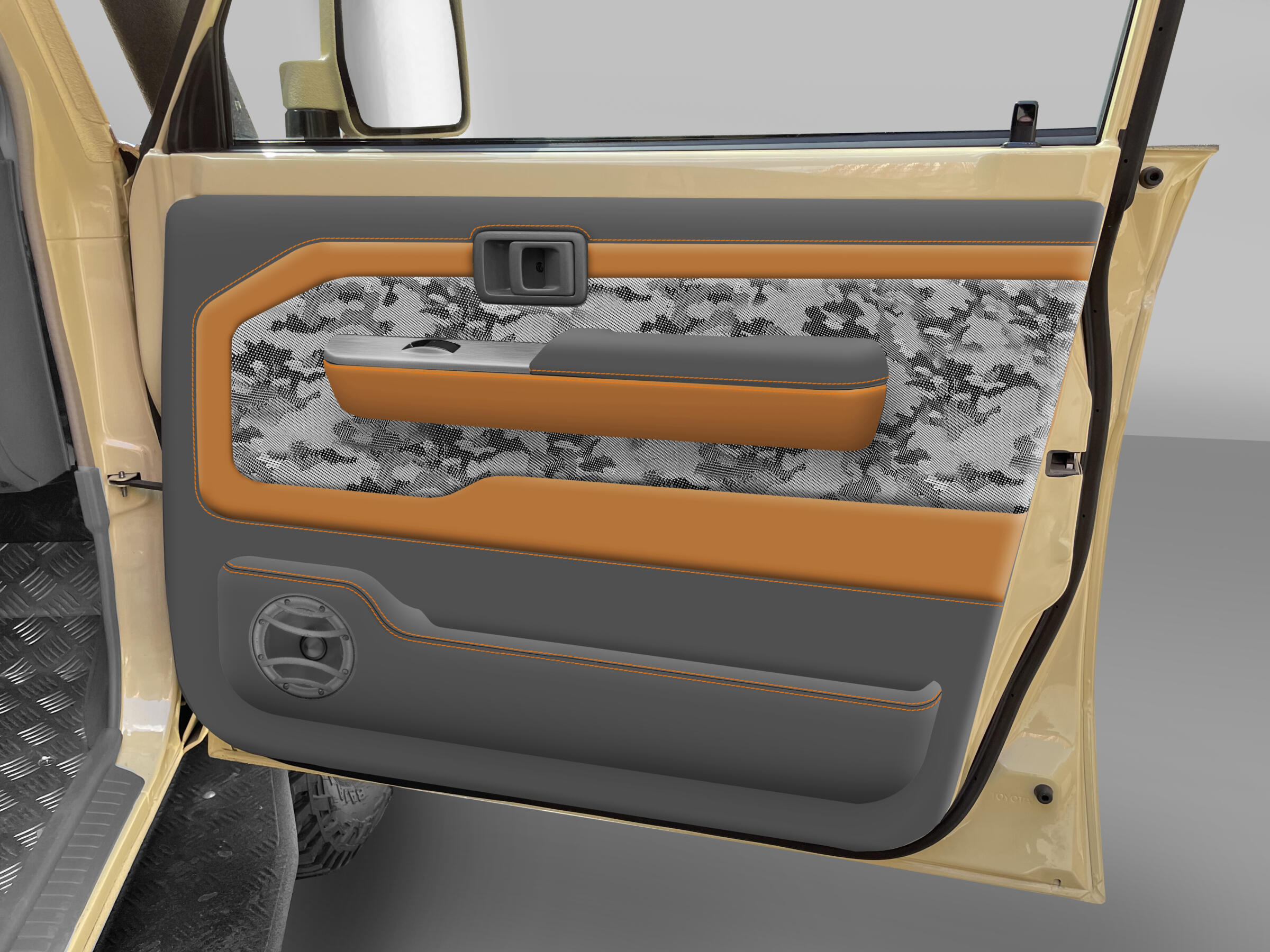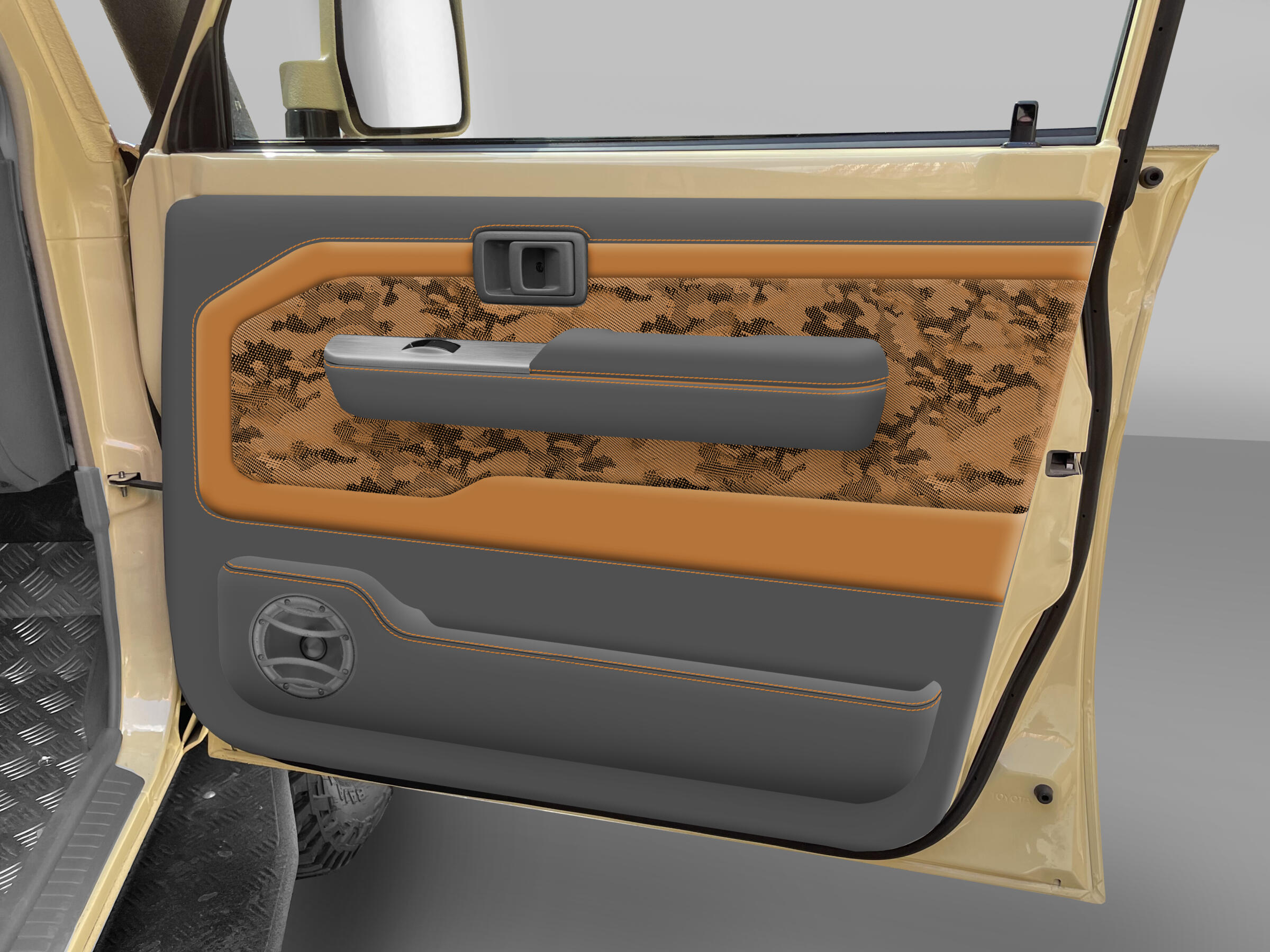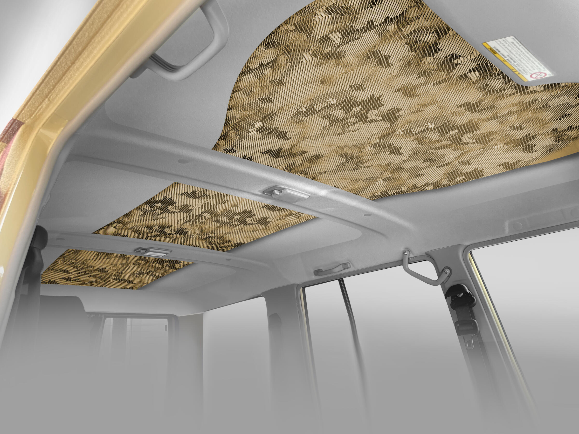 Также в авто использован аквапринт вместо шпонированных деталей и кожа с шелкографией . Рисунок на коже — камуфляж
