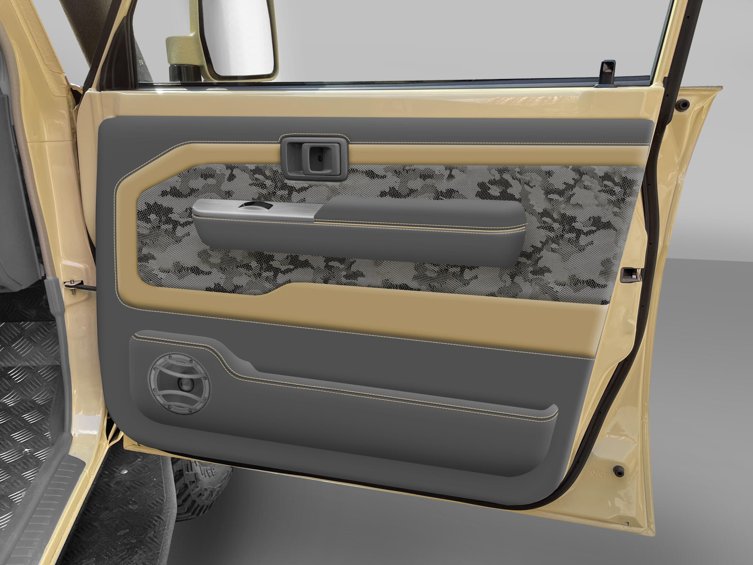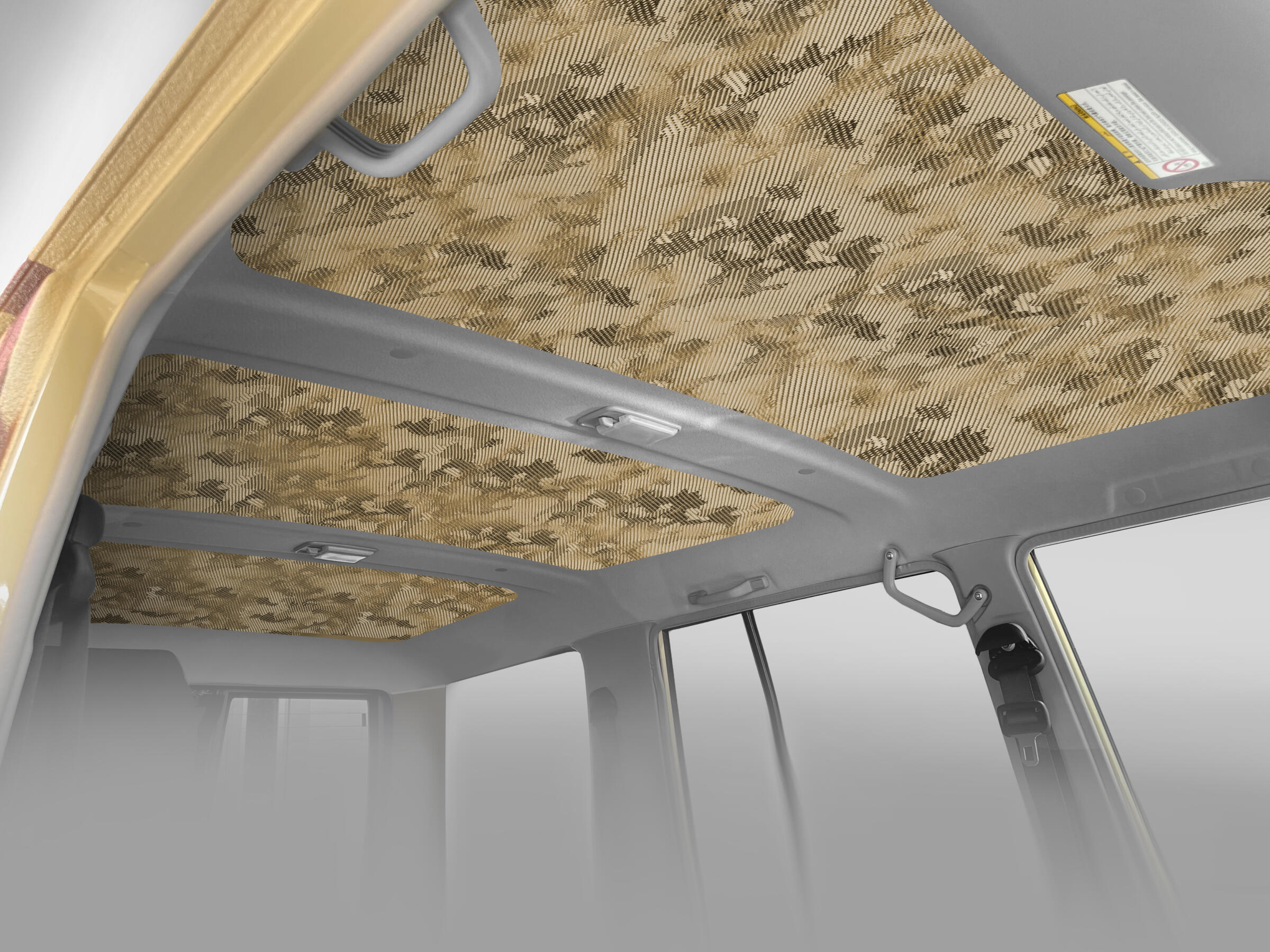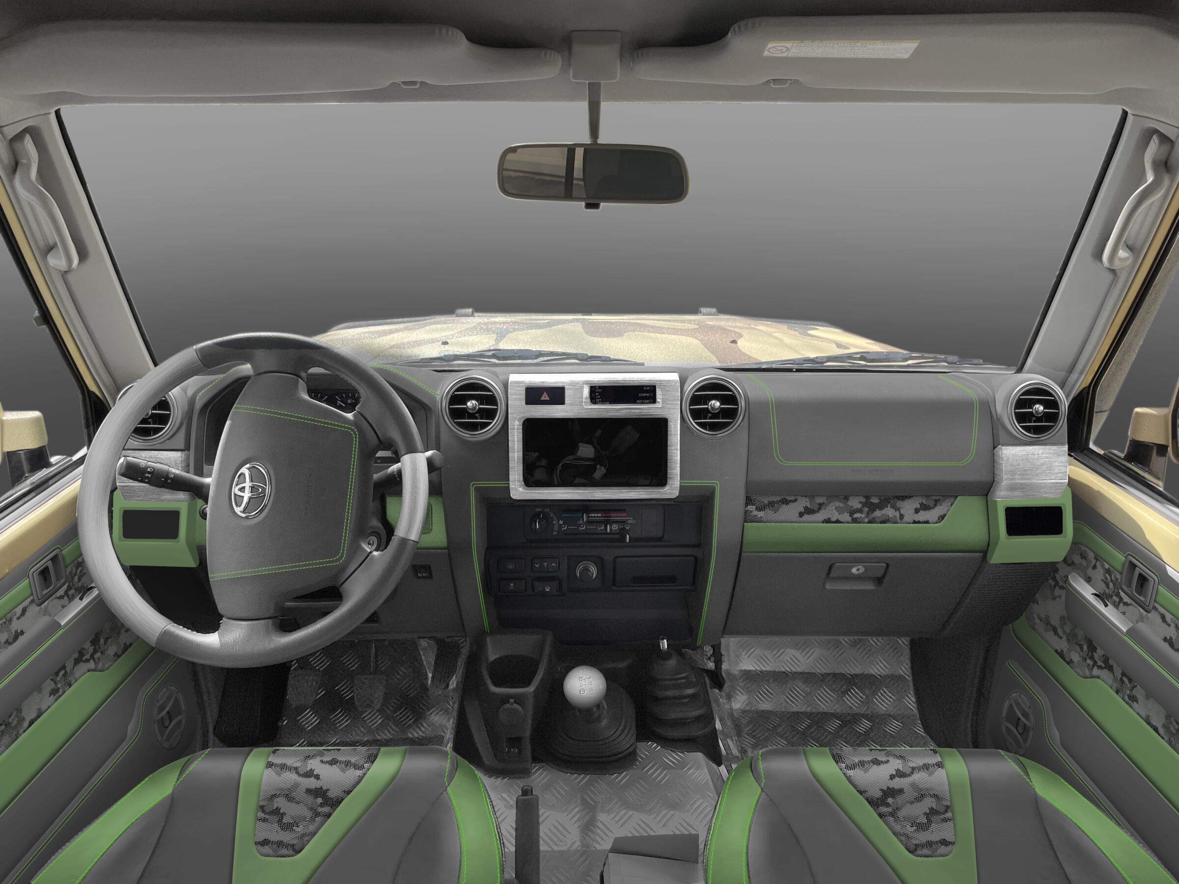Также в авто использован аквапринт вместо шпонированных деталей и кожа с шелкографией . Рисунок на коже — камуфляж